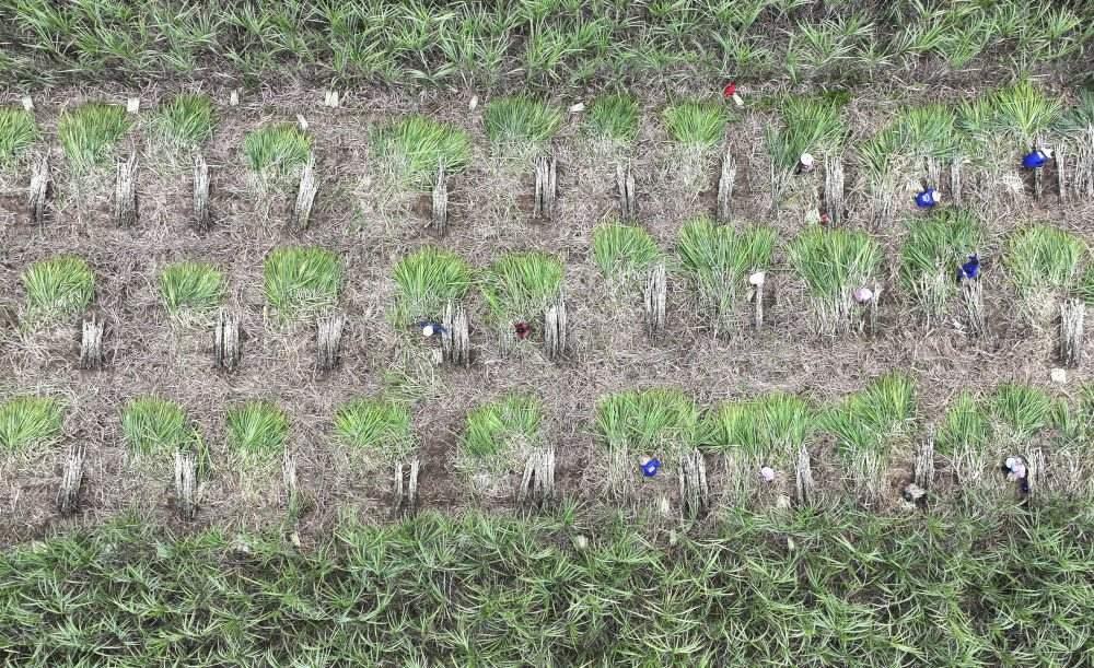 2023年12月12日,在廣西來賓市興賓區(qū)小平陽鎮(zhèn),農民在收割甘蔗(無人機照片)。新華社記者 周華 攝