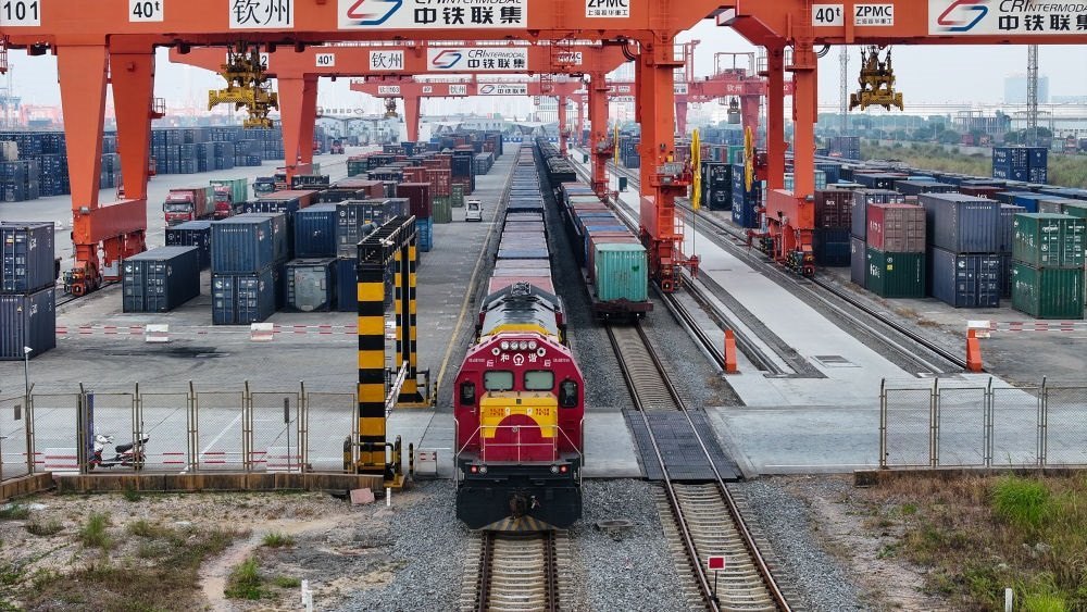 在欽州集裝箱中心站,鐵海聯(lián)運班列整裝待發(fā)(11月24日攝,無人機照片)。新華社記者 張愛林 攝