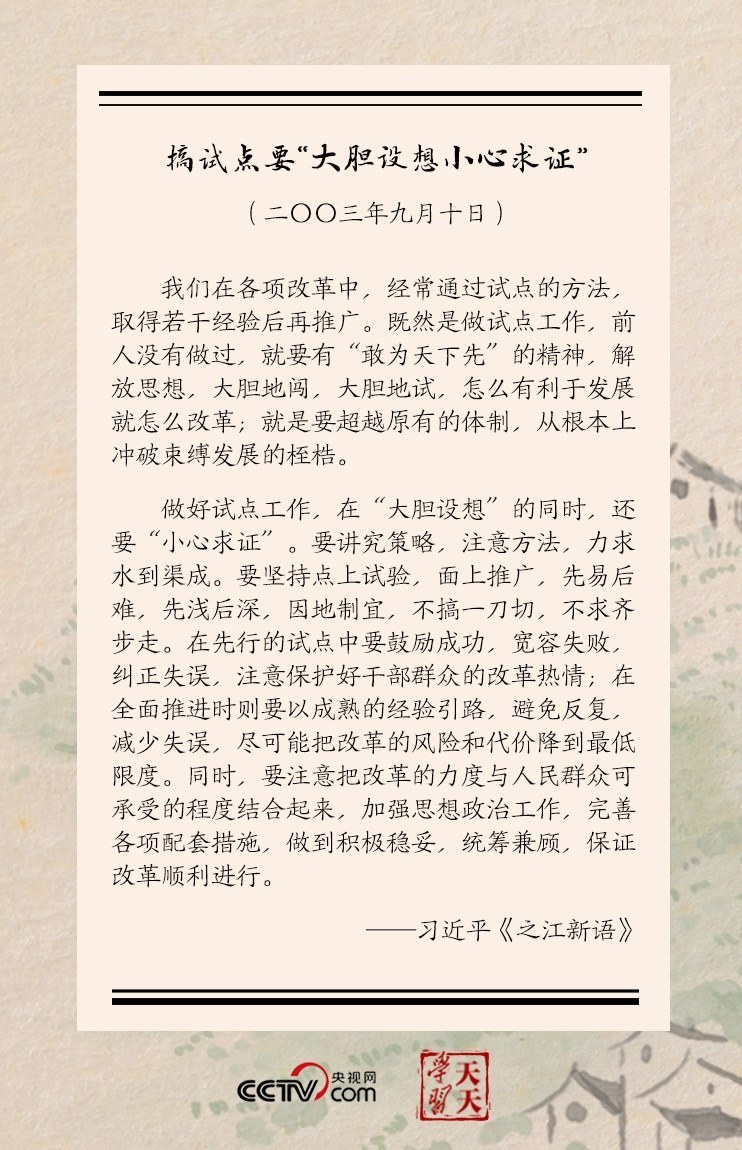 習(xí)近平還進(jìn)一步分析,做好試點(diǎn)工作,在“大膽設(shè)想”的同時(shí),還要“小心求證”……要堅(jiān)持點(diǎn)上試驗(yàn),面上推廣,先易后難,先淺后深,因地制宜,不搞一刀切,不求齊步走……