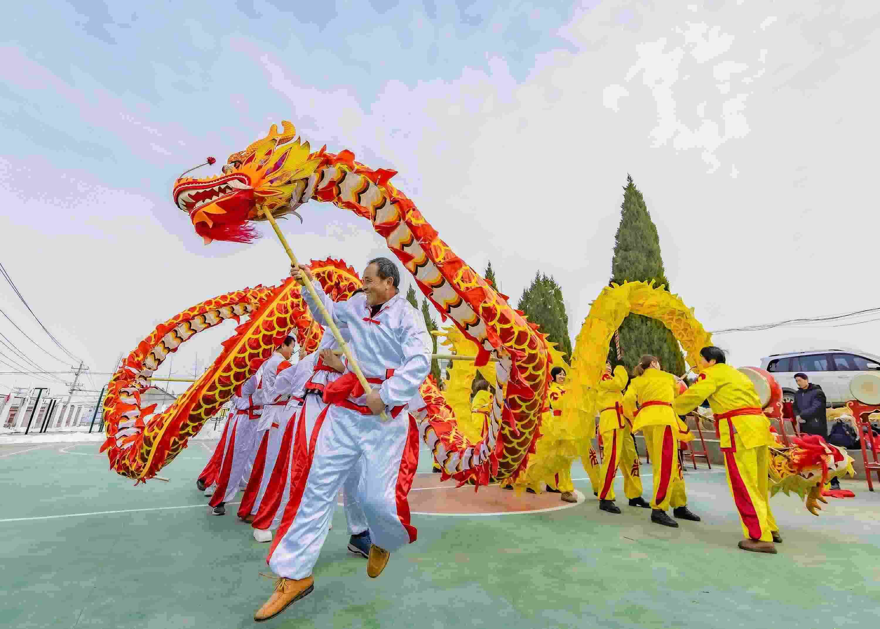 △ 江蘇宿遷兩支舞龍隊正在為村民表演雙龍狂舞鬧新春。