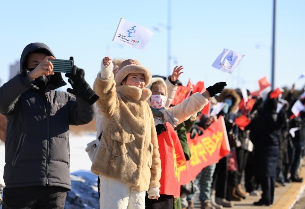 2月3日,在內(nèi)蒙古呼倫貝爾市舉行的“十四冬”火炬?zhèn)鬟f活動上,路邊群眾揮手歡呼。新華社發(fā)(康文魁攝)