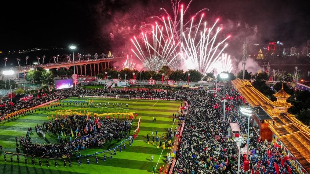 2月3日,音樂煙花秀在榕江縣舉辦的貴州“村超村晚”上演(無人機(jī)照片)。新華社記者劉續(xù) 攝