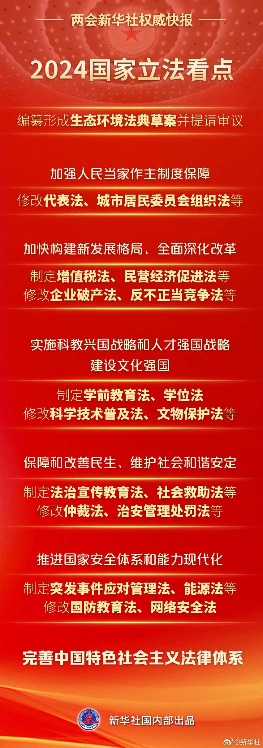 8日提請十四屆全國人大二次會議審議的全國人大常委會工作報告提出,2024年,要認(rèn)真落實常委會立法規(guī)劃,完善中國特色社會主義法律體系:制定民營經(jīng)濟(jì)促進(jìn)法、學(xué)前教育法、社會救助法等,修改城市居民委員會組織法、文物保護(hù)法、網(wǎng)絡(luò)安全法等。