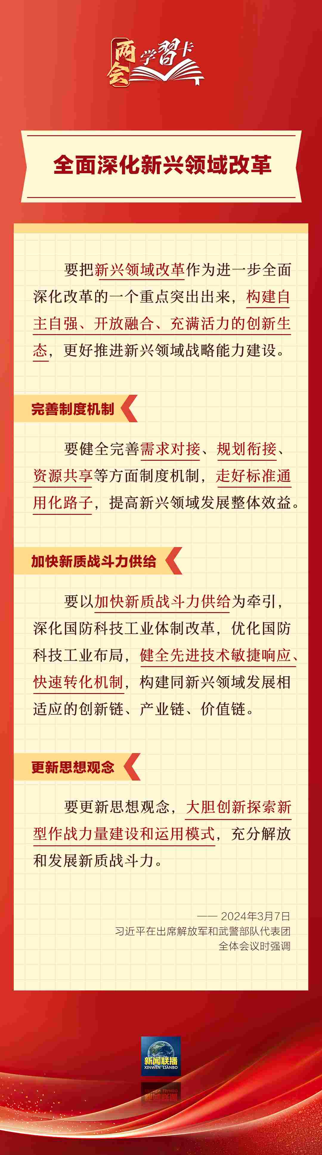 3月7日,習(xí)近平在出席解放軍和武警部隊(duì)代表團(tuán)全體會(huì)議時(shí)強(qiáng)調(diào),強(qiáng)化使命擔(dān)當(dāng),深化改革創(chuàng)新,全面提升新興領(lǐng)域戰(zhàn)略能力。如何提升新興領(lǐng)域戰(zhàn)略能力?一起學(xué)習(xí)↓↓↓