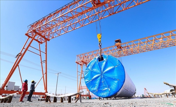 △ 2024年3月7日,甘肅省張掖市,工人們正在吊裝風力發(fā)電機組塔筒,準備運往安裝現(xiàn)場。