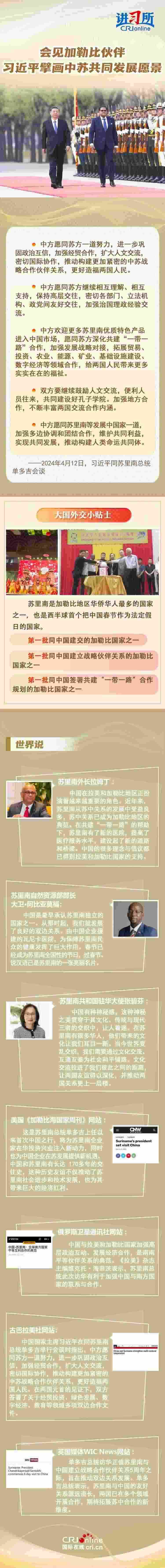 蘇里南是第一批同中國(guó)建交的加勒比國(guó)家之一。幾十年來(lái),兩國(guó)雖相距萬(wàn)里,卻始終相互尊重、平等相待,有著深厚的兄弟情誼。此次兩國(guó)元首會(huì)談受到國(guó)際社會(huì)關(guān)注,評(píng)論稱兩國(guó)關(guān)系是南南合作的典范。