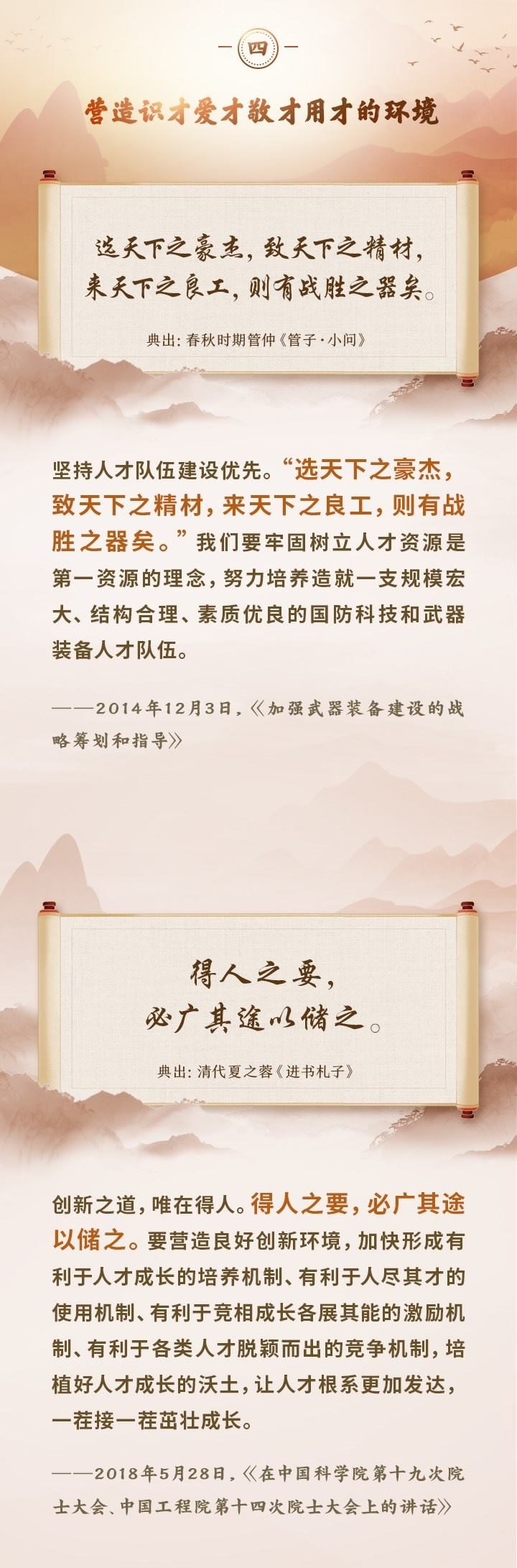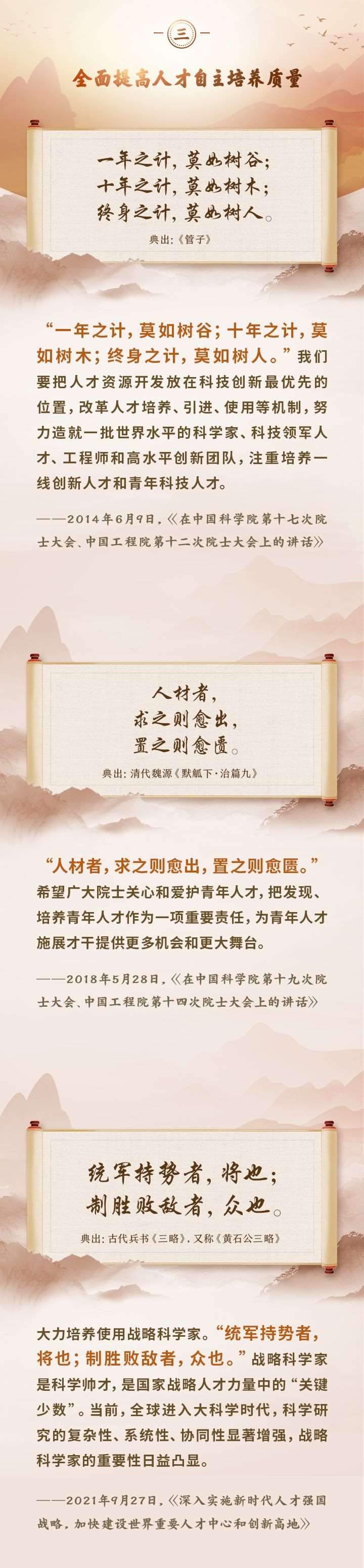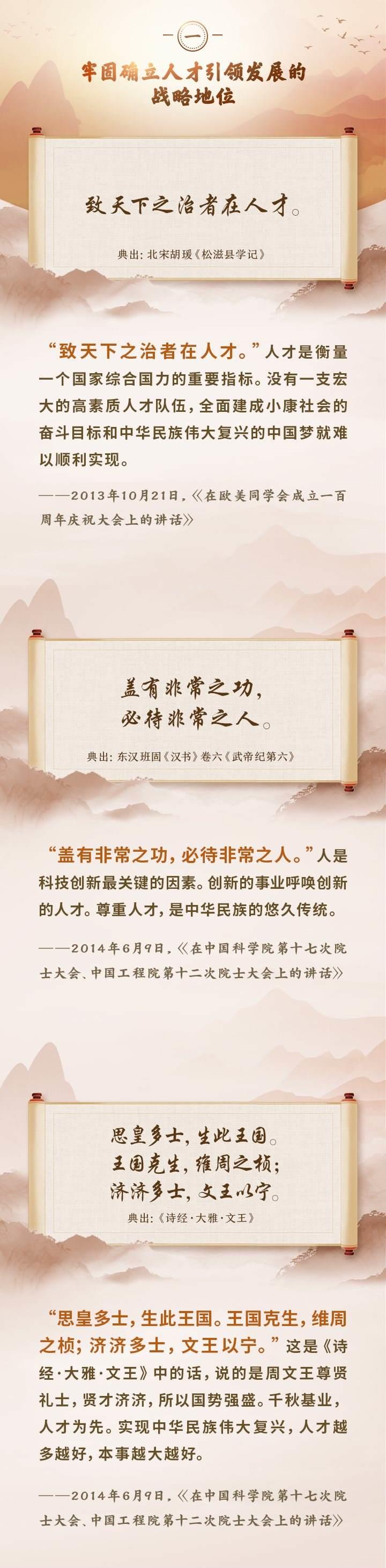 編者按:培養(yǎng)造就大批德才兼?zhèn)涞母咚刭|(zhì)人才,是國(guó)家和民族長(zhǎng)遠(yuǎn)發(fā)展大計(jì)。黨的十八大以來,習(xí)近平總書記圍繞人才工作發(fā)表一系列重要論述,立意高遠(yuǎn),內(nèi)涵豐富,思想深刻,深刻回答了為什么建設(shè)人才強(qiáng)國(guó)、什么是人才強(qiáng)國(guó)、怎樣建設(shè)人才強(qiáng)國(guó)的重大理論和實(shí)踐問題。在這些重要論述中,總書記精妙運(yùn)用古代典籍、經(jīng)典名句,以古喻今、啟迪思想、激蕩精神,讓我們一起來學(xué)習(xí)!