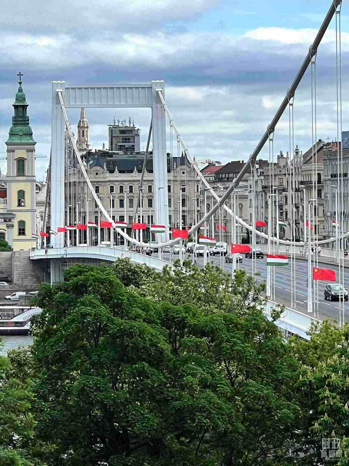 △懸掛中匈兩國國旗的布達(dá)佩斯伊麗莎白大橋。(總臺央視記者石偉明拍攝)