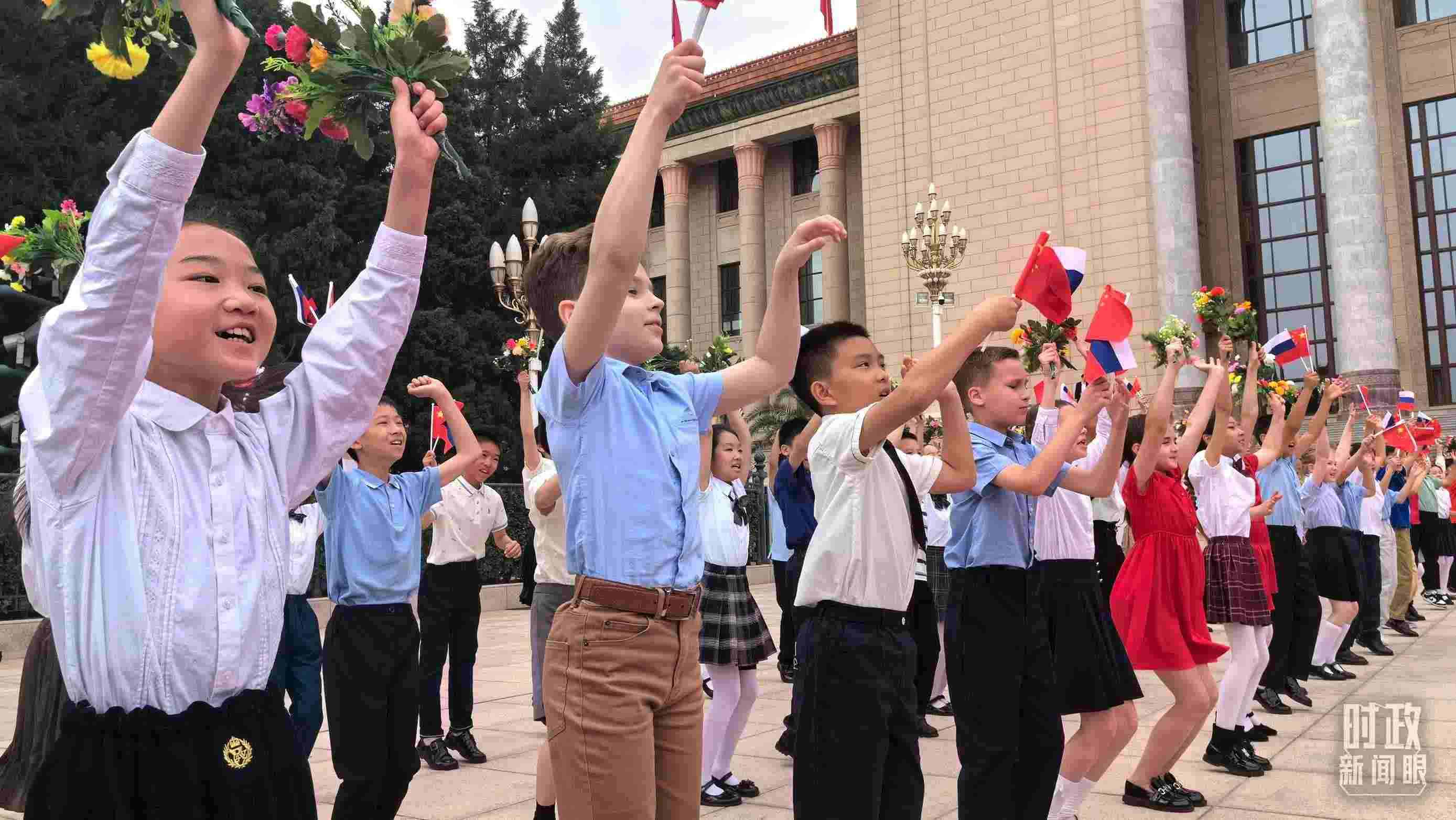 現(xiàn)場有兩個特殊的安排。一個是軍樂團(tuán)的演奏曲目。軍樂團(tuán)選取了《莫斯科郊外的晚上》作為迎賓曲。另一個是少年兒童歡迎群體。儀式現(xiàn)場除了中國小朋友,在華的俄羅斯小朋友也來參加活動。這些周到細(xì)致的安排,傳遞的是世代友好的情誼。