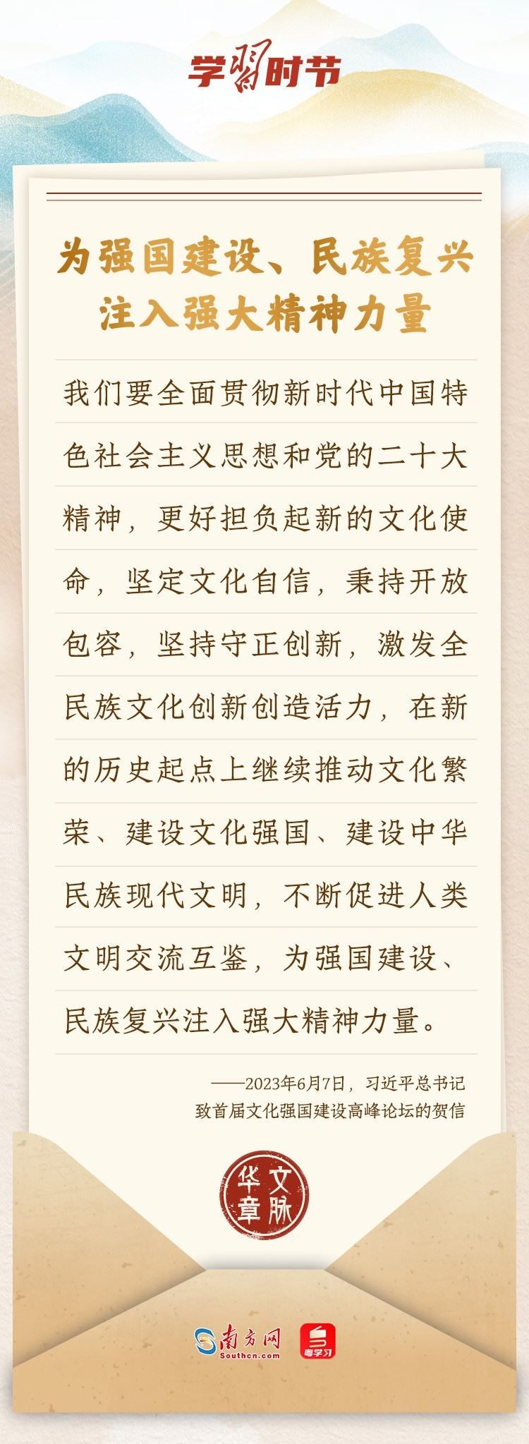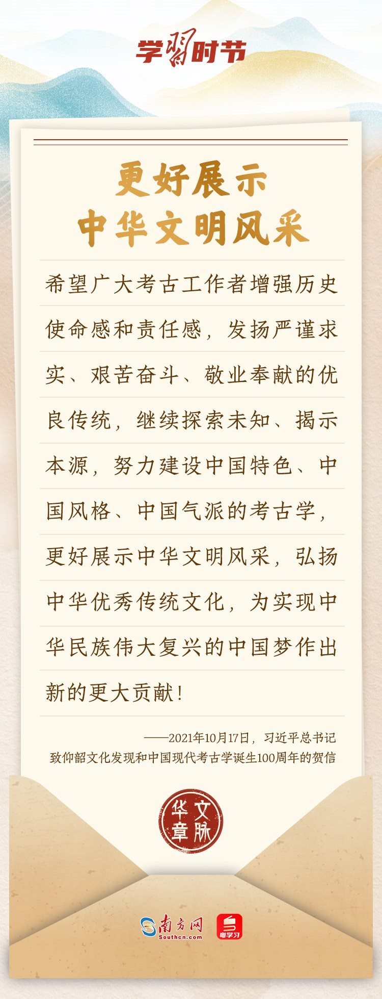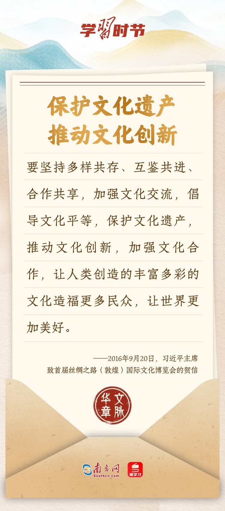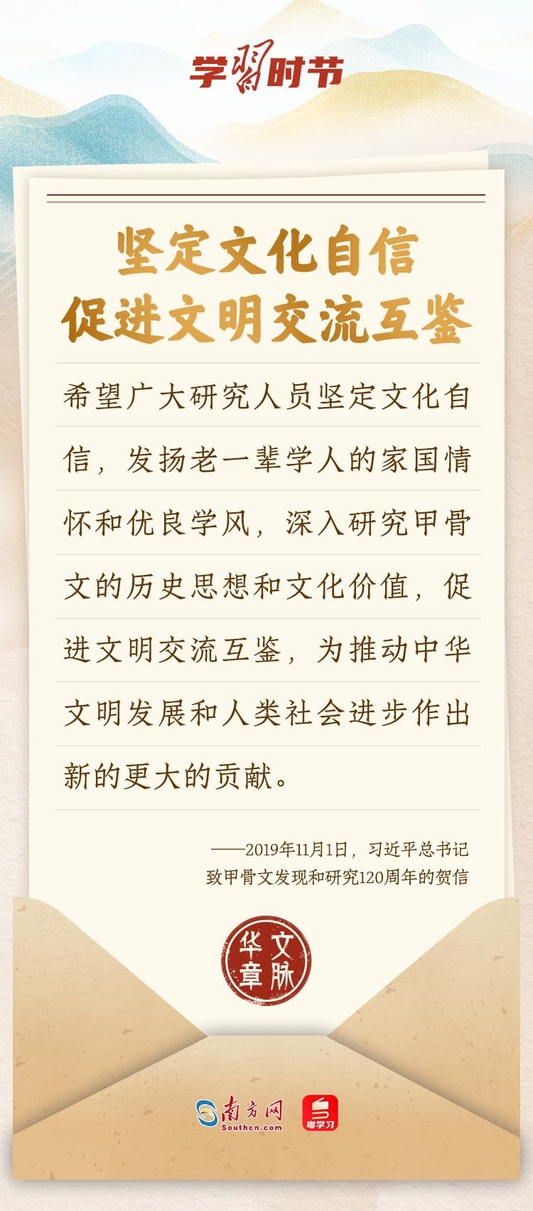 “中華民族在幾千年歷史中創(chuàng)造和延續(xù)的中華優(yōu)秀傳統(tǒng)文化,是中華民族的根和魂?!绷?xí)近平總書記多次通過發(fā)賀信、寫回信等方式,表達著對弘揚中華優(yōu)秀傳統(tǒng)文化的殷切希望,飽含深情、字字暖心、催人奮進。讓我們一起“讀”信。