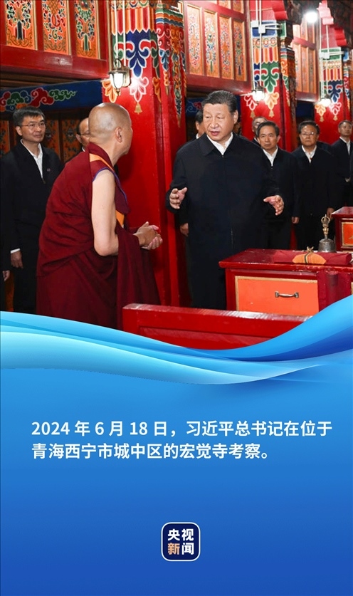 6月18日,正在青??疾斓牧?xí)近平總書記來到位于西寧市城中區(qū)的宏覺寺。在寺前院落,宏覺寺民主管理委員會(huì)負(fù)責(zé)人向總書記敬獻(xiàn)哈達(dá),僧人提香爐、持寶傘迎接總書記。