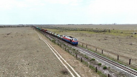 2023年5月12日,在哈薩克斯坦阿拉木圖附近,貨運(yùn)列車(chē)馳騁于阿拉木圖與中國(guó)霍爾果斯間(無(wú)人機(jī)照片)。新華社發(fā)(奧斯帕諾夫攝)