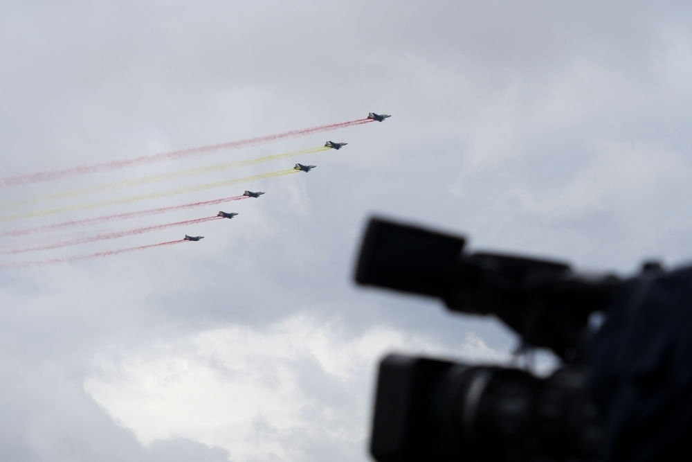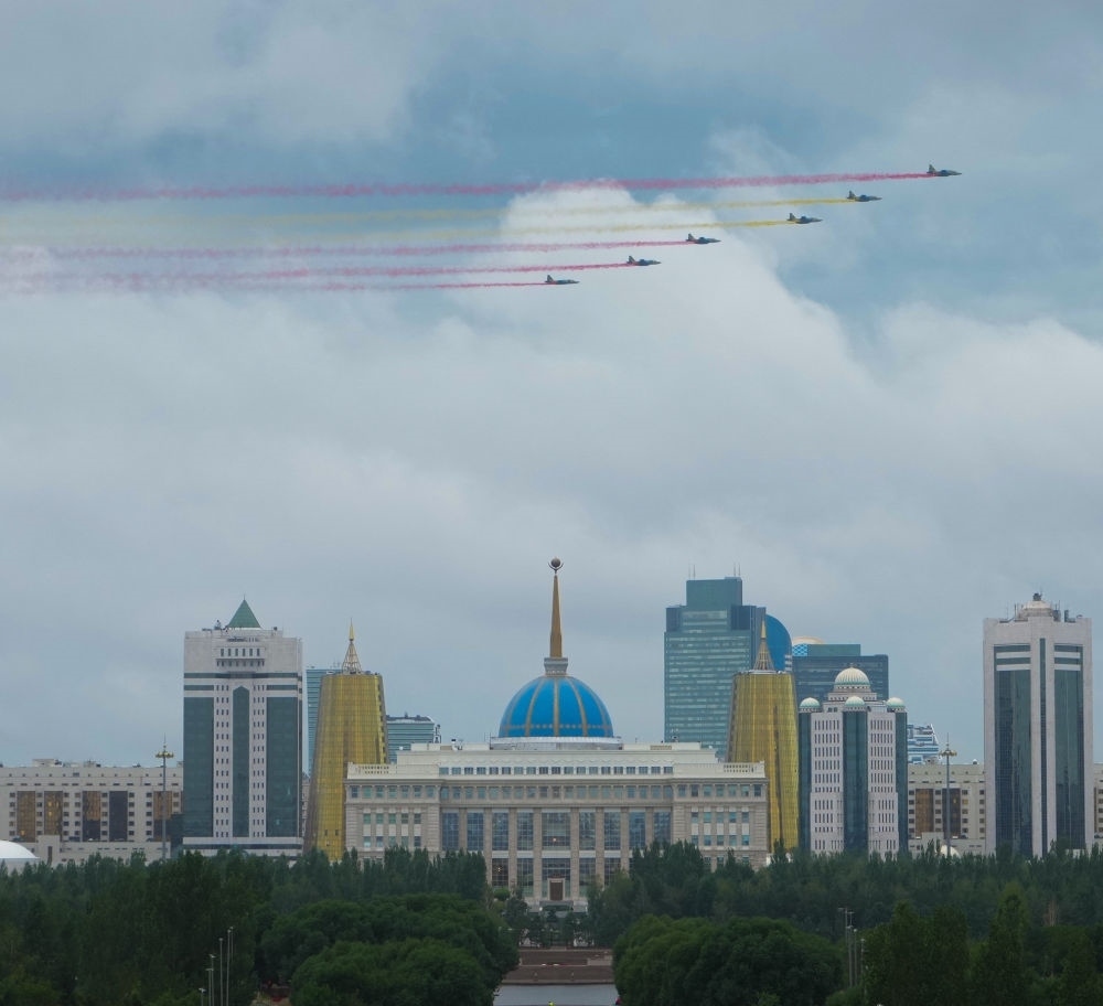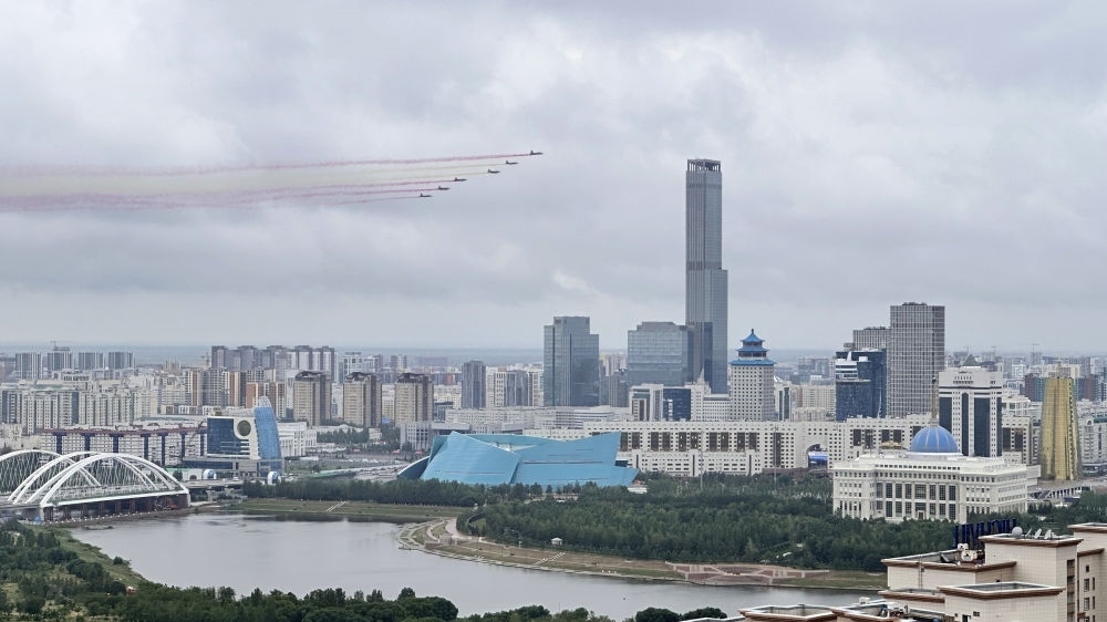習(xí)近平主席抵達(dá)時,哈方多架戰(zhàn)機(jī)在總統(tǒng)府上空拉出中國國旗色彩煙歡迎中國貴賓。