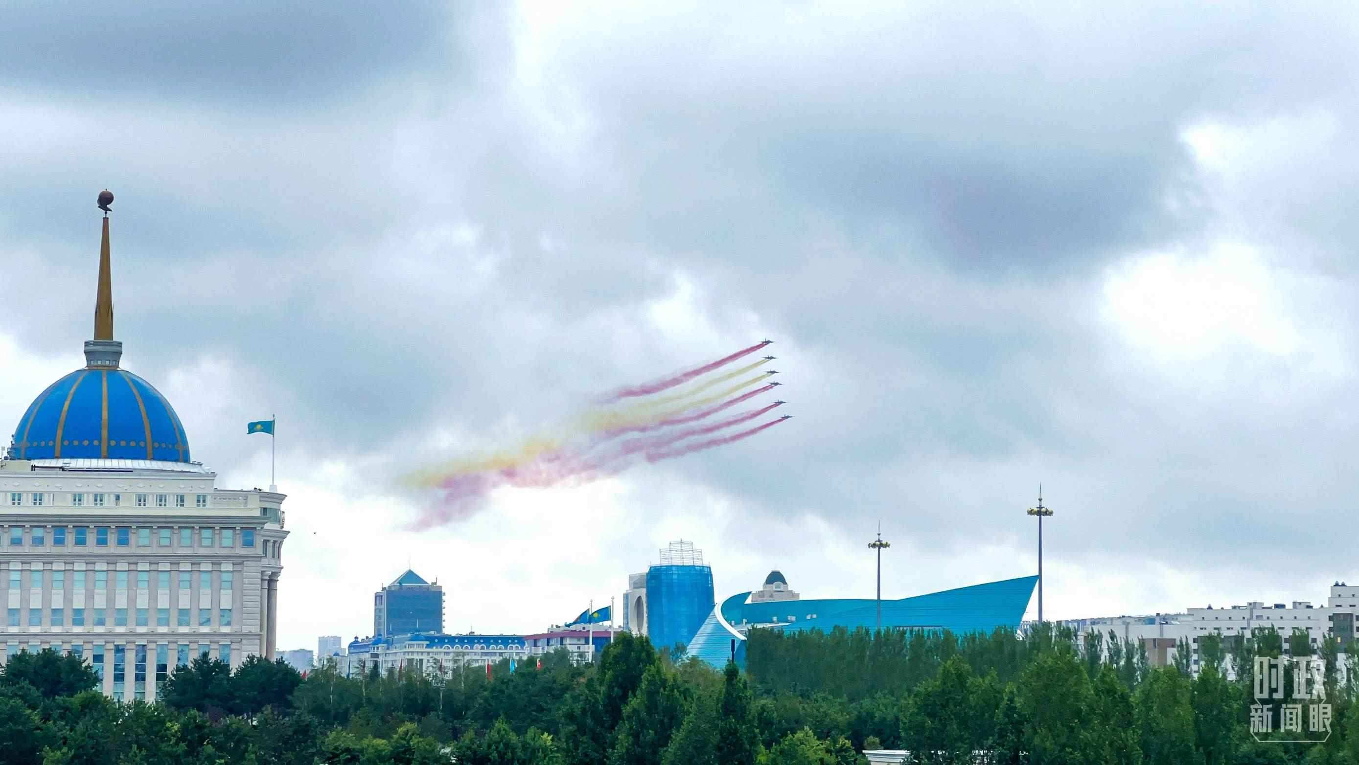 習(xí)主席乘車抵達(dá)哈總統(tǒng)府時(shí),托卡耶夫總統(tǒng)熱情迎接。六架哈薩克斯坦空軍戰(zhàn)機(jī)從總統(tǒng)府上空飛過(guò),拉出象征中國(guó)國(guó)旗色彩的紅黃色彩煙,以最高禮儀歡迎中國(guó)貴賓。