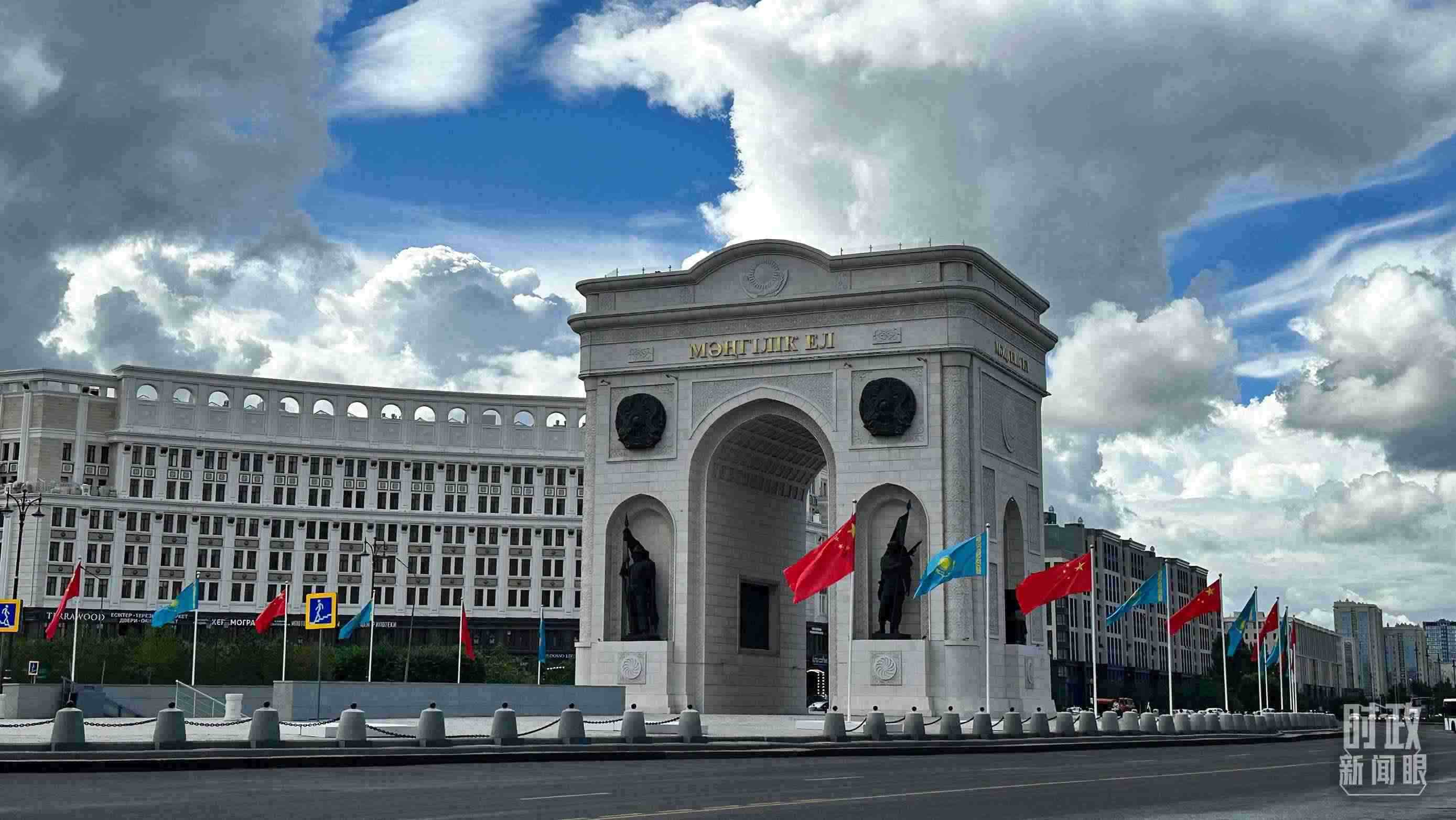 △阿斯塔納地標(biāo)建筑“凱旋門”兩側(cè),中哈兩國(guó)國(guó)旗迎風(fēng)招展。(總臺(tái)央視記者關(guān)舟拍攝)