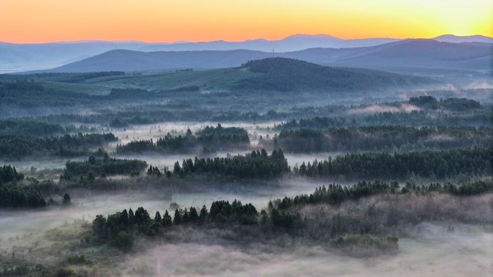 7月5日清晨,位于河北省承德市的塞罕壩國家森林公園雨后晨霧飄渺、滿目青翠(無人機照片)。