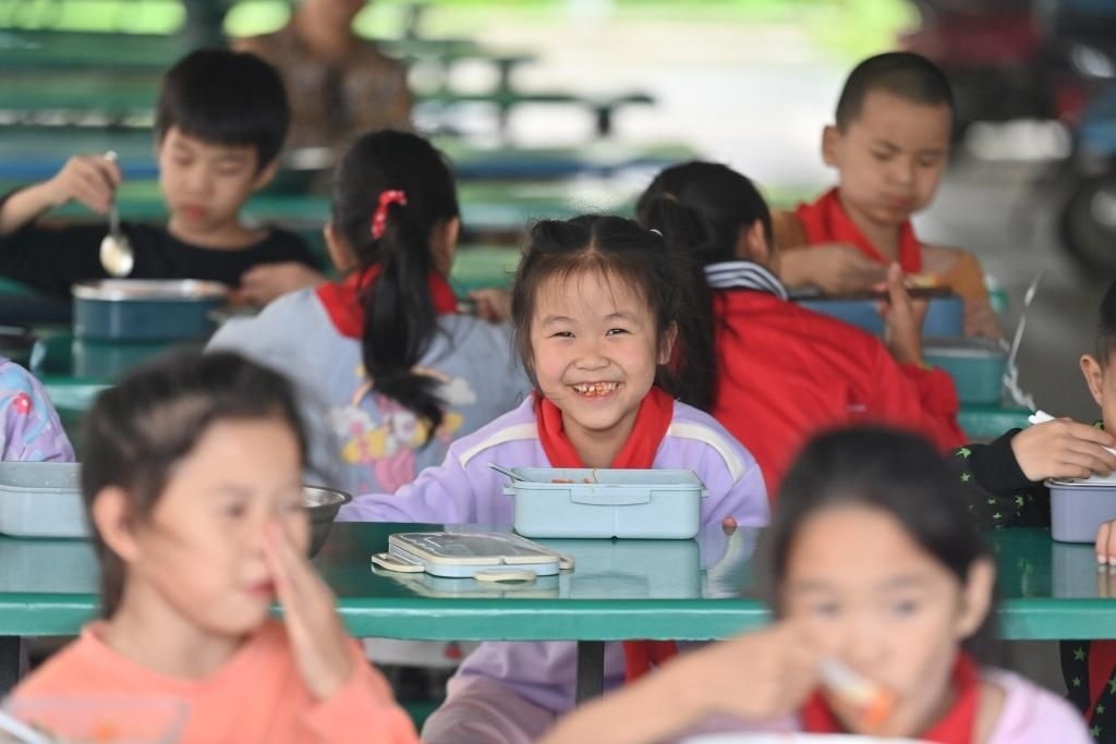 5月31日,廣西柳州市柳江區(qū)三都鎮(zhèn)覺山教學點,學生們在吃營養(yǎng)午餐。