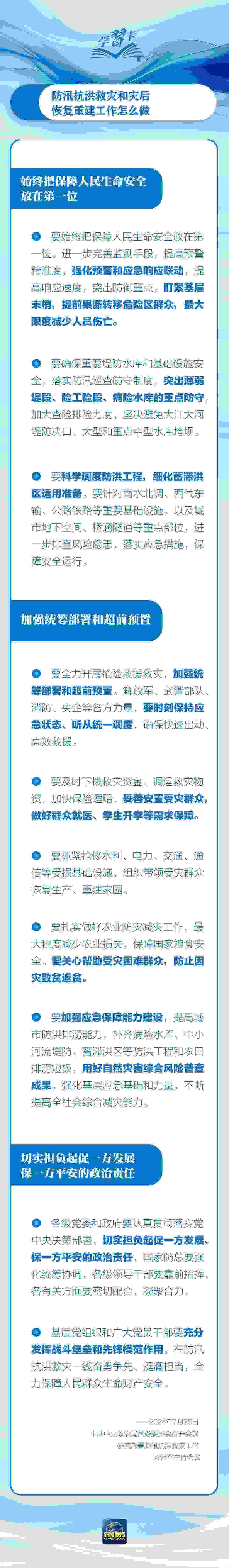 近日,中共中央政治局常委會(huì)召開會(huì)議,研究部署防汛抗洪救災(zāi)工作,習(xí)近平主持會(huì)議并發(fā)表重要講話。