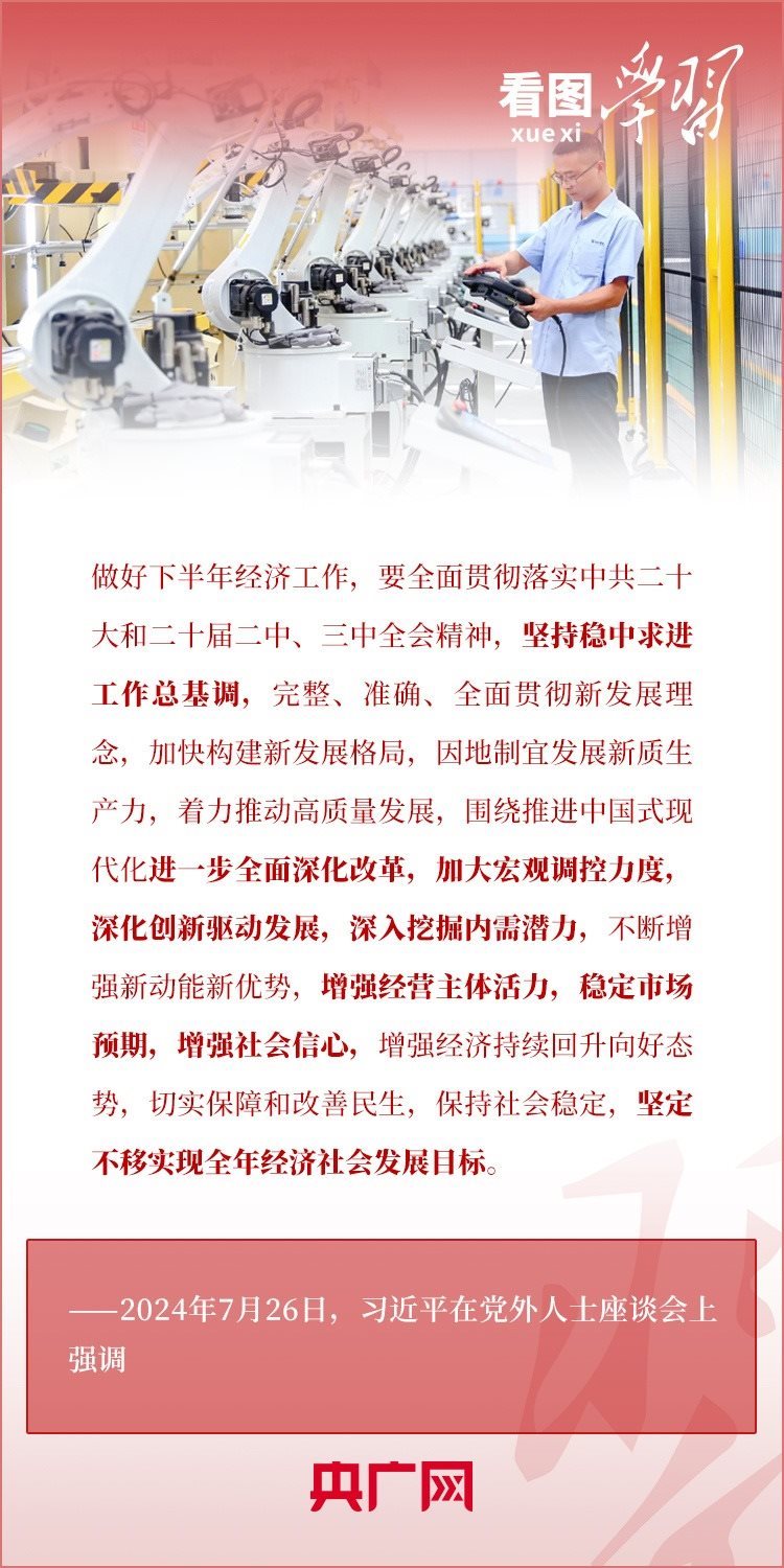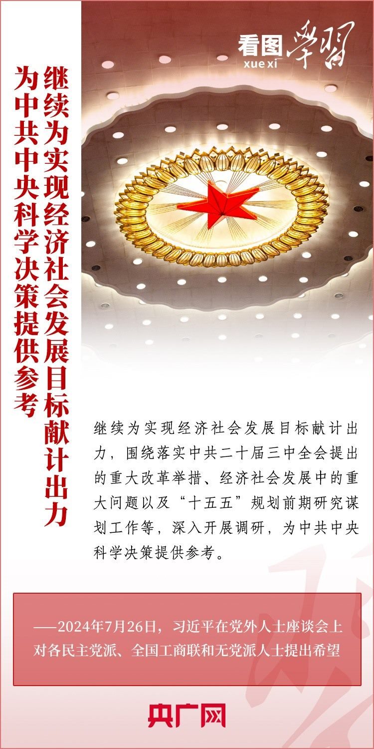 中共中央7月26日在中南海召開黨外人士座談會(huì),就當(dāng)前經(jīng)濟(jì)形勢和下半年經(jīng)濟(jì)工作聽取各民主黨派中央、全國工商聯(lián)負(fù)責(zé)人和無黨派人士代表的意見和建議。習(xí)近平總書記主持座談會(huì)并發(fā)表重要講話,對做好下半年經(jīng)濟(jì)工作作出重要部署,并對黨外人士提出3點(diǎn)希望。一起來學(xué)習(xí)!