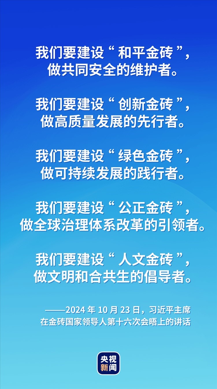 對于如何推動“大金磚合作”高質(zhì)量發(fā)展,習近平主席提出五點建議——建設(shè)“和平金磚”“創(chuàng)新金磚”“綠色金磚”“公正金磚”“人文金磚”,攜手更多“全球南方”國家共同推動構(gòu)建人類命運共同體。