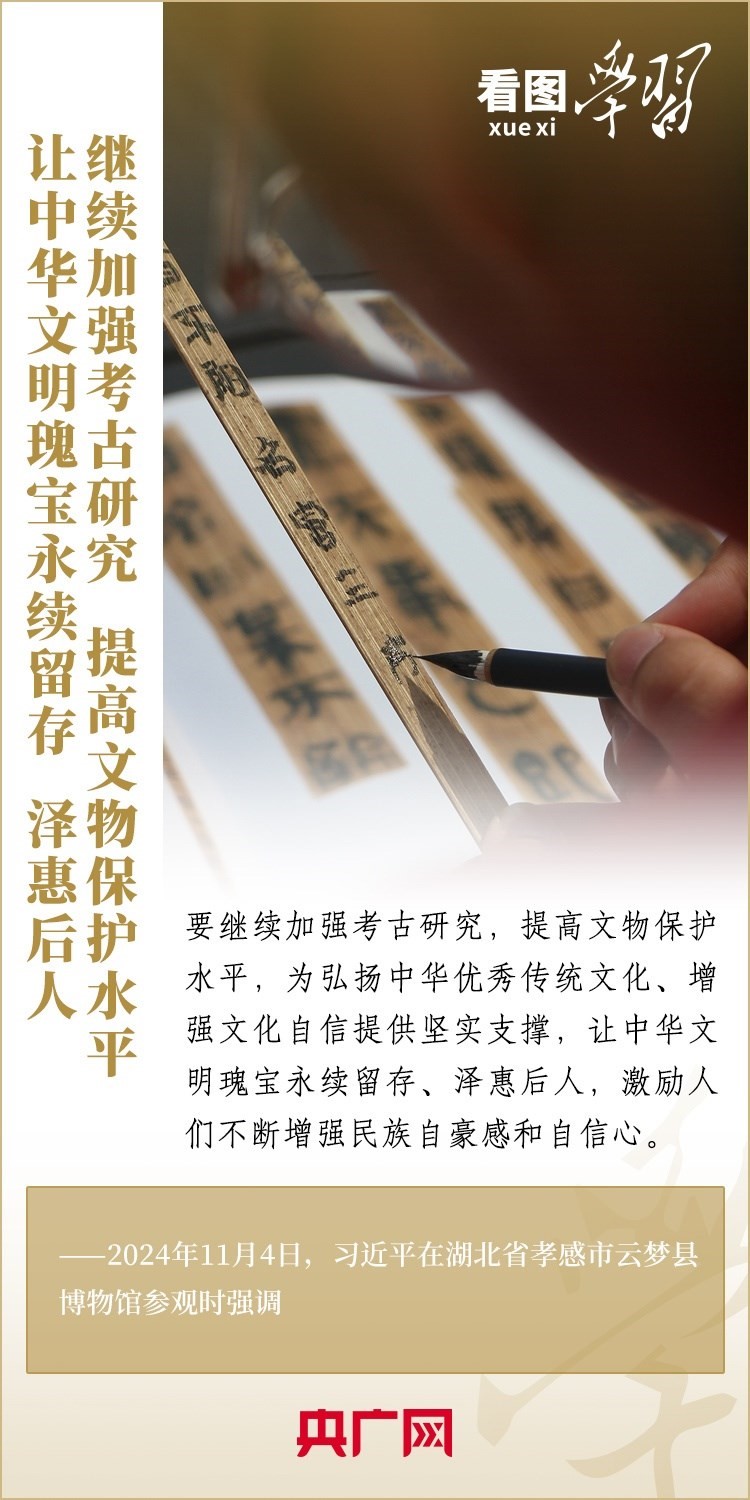 11月4日,習(xí)近平總書記在湖北省孝感市云夢(mèng)縣博物館參觀出土秦漢簡(jiǎn)牘展。這里收藏的我國考古史上首次發(fā)現(xiàn)的秦簡(jiǎn)——云夢(mèng)睡虎地秦簡(jiǎn),反映了戰(zhàn)國晚期到秦始皇時(shí)期的政治、經(jīng)濟(jì)、文化、法律、軍事等方面的情況。習(xí)總書記詳細(xì)聽取簡(jiǎn)牘內(nèi)容、歷史文化價(jià)值和保護(hù)研究情況介紹,指出要繼續(xù)加強(qiáng)考古研究,提高文物保護(hù)水平,讓中華文明瑰寶永續(xù)留存、澤惠后人。