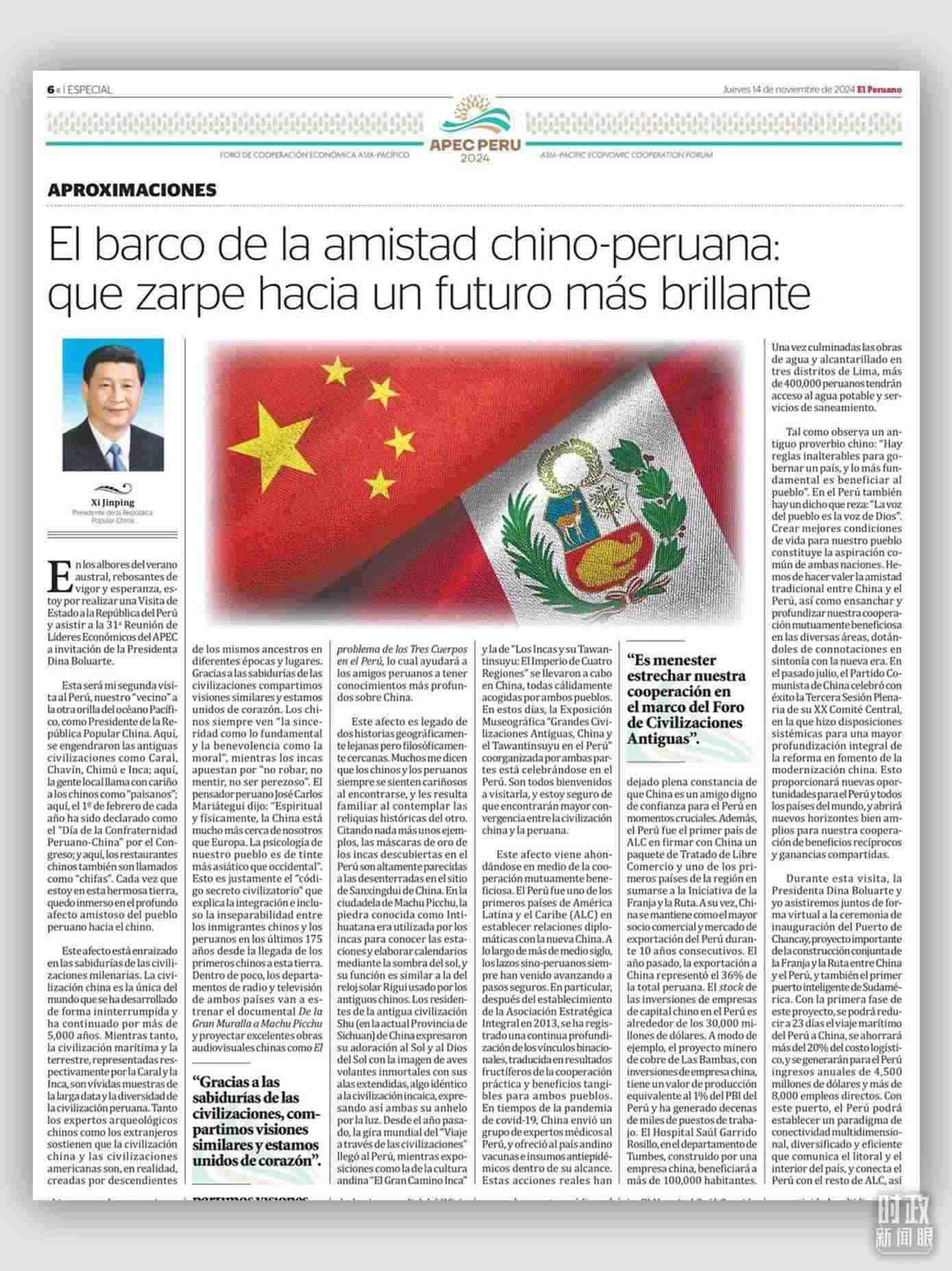 △習(xí)主席在《秘魯人報(bào)》發(fā)表題為《讓中秘友好之船揚(yáng)帆遠(yuǎn)航》的署名文章。(總臺(tái)國(guó)廣記者吳倩)