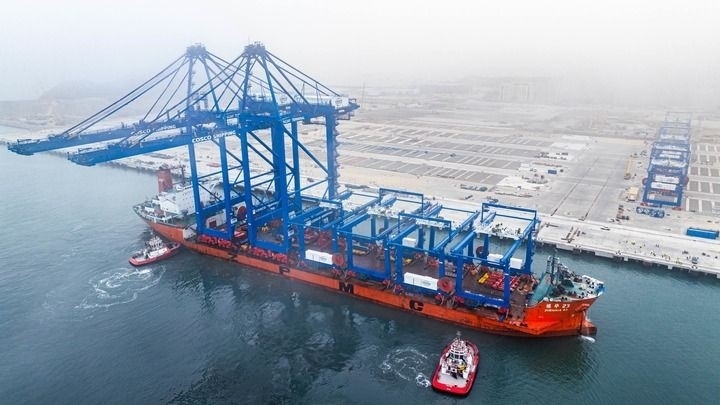 6月27日,岸邊集裝箱起重機(jī)和軌道吊運(yùn)抵秘魯錢(qián)凱港。新華社發(fā)(上海振華重工供圖)