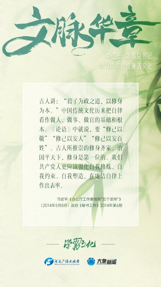 中華優(yōu)秀傳統(tǒng)文化蘊含著豐富的廉潔文化,習近平總書記曾指出:沒有中華優(yōu)秀傳統(tǒng)文化、革命文化、社會主義先進文化的底蘊和滋養(yǎng),信仰信念就難以深沉而執(zhí)著。總書記常常引經(jīng)據(jù)典,教育引導廣大黨員干部正心修身,涵養(yǎng)文化,守住為政之本。大象新聞分五期為您梳理,我們一起跟著總書記學習中華傳統(tǒng)廉潔文化。今天推出第五期。