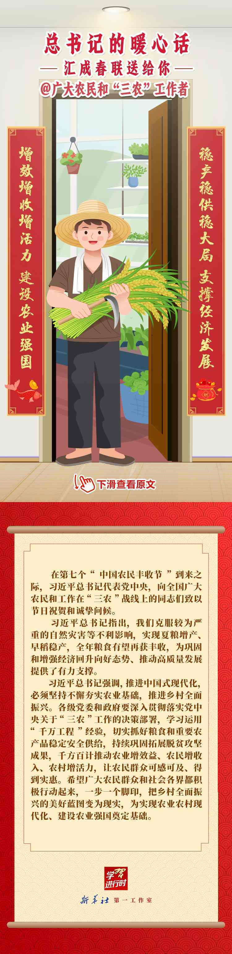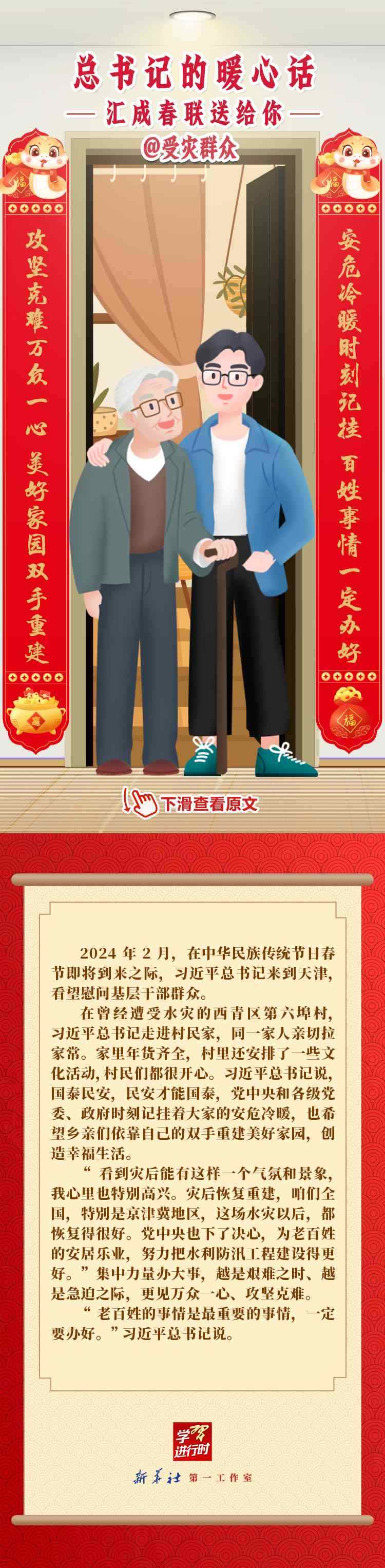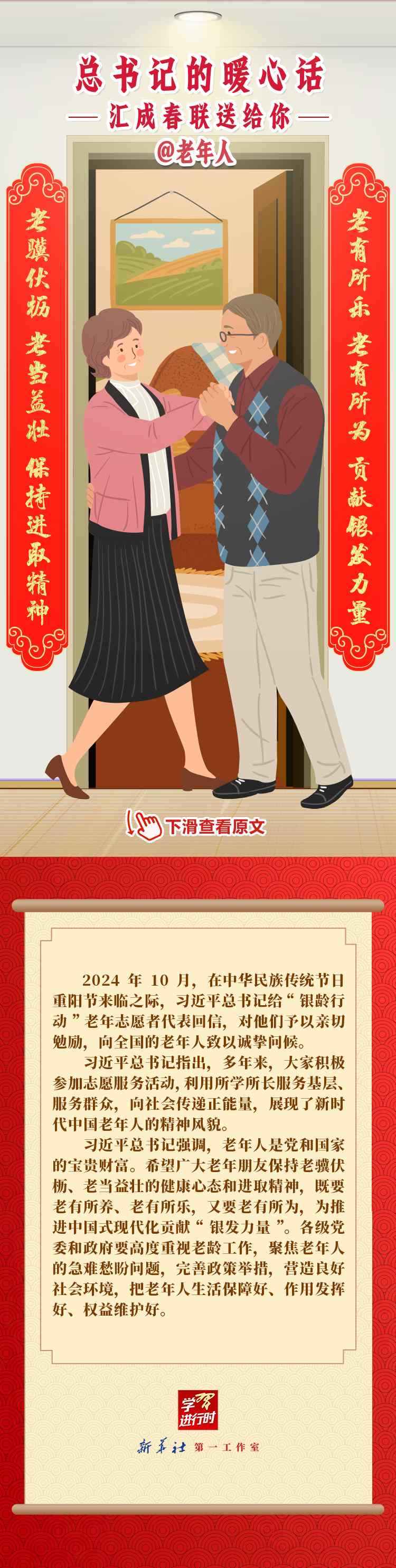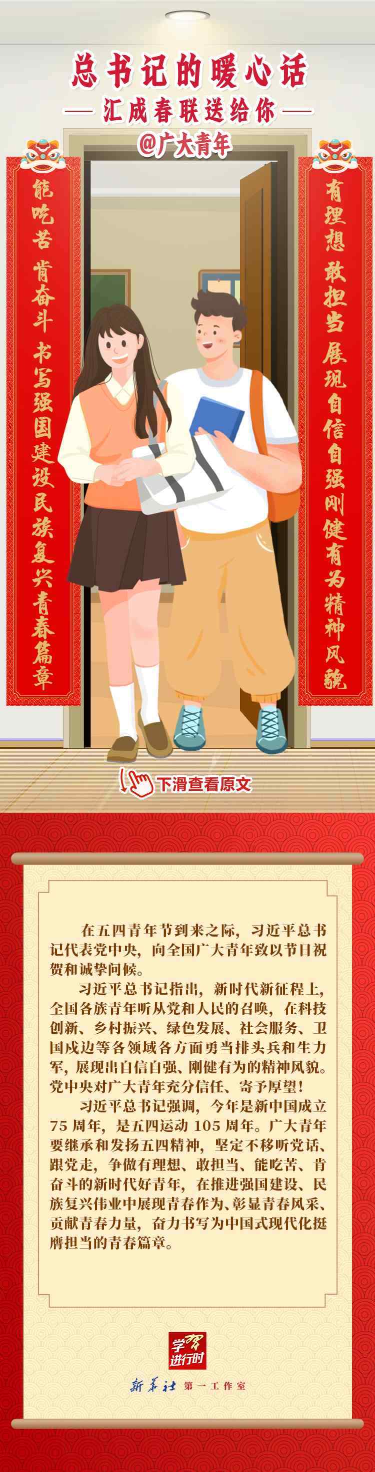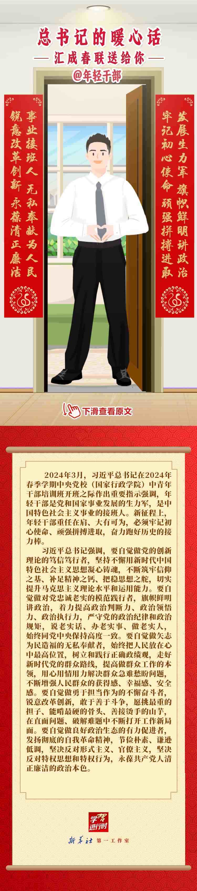 【學(xué)習(xí)進行時】過春節(jié),貼春聯(lián),寄托人們對新年的美好愿望。過去一年,習(xí)近平總書記在不同場合點贊各行各業(yè)奮斗者,說了許多暖心話。新春之際,我們匯編成聯(lián),向新征程上的每一位“主角”致敬,送上新春的祝福。