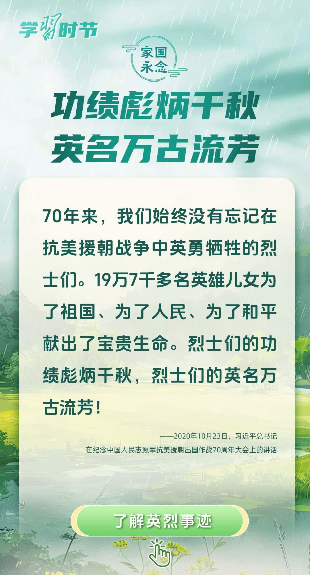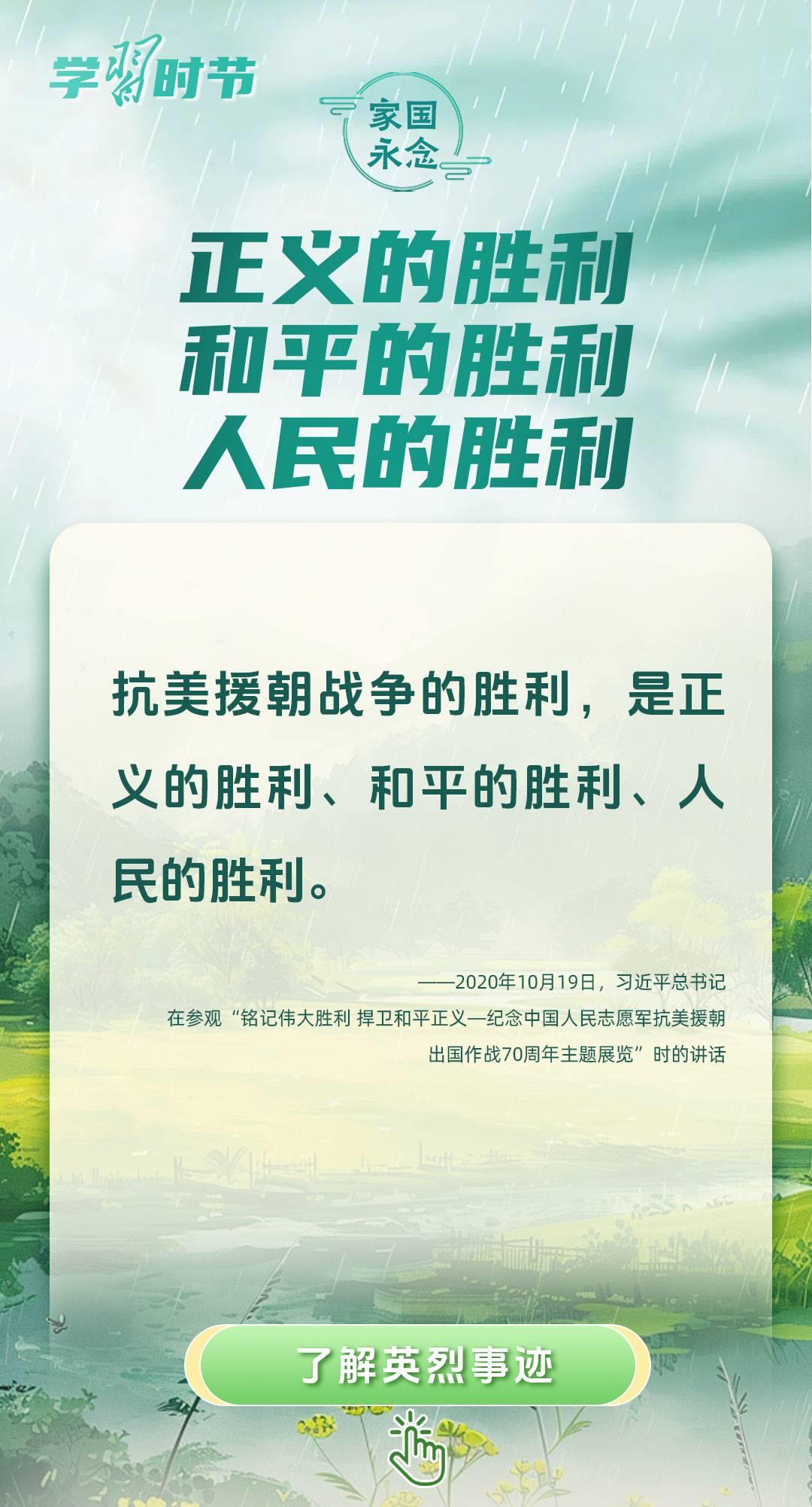 今年是中國(guó)人民抗日戰(zhàn)爭(zhēng)暨世界反法西斯戰(zhàn)爭(zhēng)勝利80周年、中國(guó)人民志愿軍抗美援朝出國(guó)作戰(zhàn)75周年。習(xí)近平總書記曾說(shuō):“對(duì)一切為國(guó)家、為民族、為和平付出寶貴生命的人們,不管時(shí)代怎樣變化,我們都要永遠(yuǎn)銘記他們的犧牲和奉獻(xiàn)。”今天我們所擁有的一切,無(wú)不凝結(jié)著英雄、英烈們的奉獻(xiàn)付出乃至巨大犧牲。