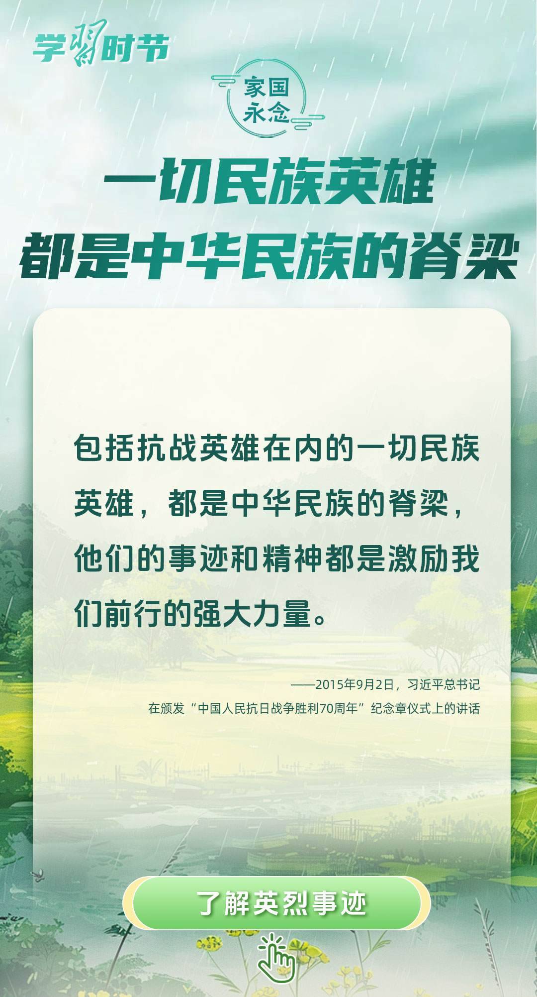 黨的十八大以來(lái),習(xí)近平總書記曾在多個(gè)場(chǎng)合講述英烈故事、致敬英烈精神、緬懷英烈忠魂,表達(dá)對(duì)英烈的崇敬之情。清明節(jié)到來(lái)之際,讓我們重溫習(xí)近平總書記的相關(guān)重要講話,崇尚英雄、緬懷英烈,厚植家國(guó)情懷,凝聚前行力量。