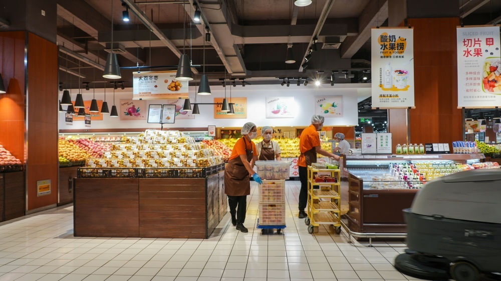 在河南許昌的胖東來(lái)生活廣場(chǎng)店內(nèi),店員正在做當(dāng)天開(kāi)業(yè)前的準(zhǔn)備工作。新華社記者 劉振坤 攝