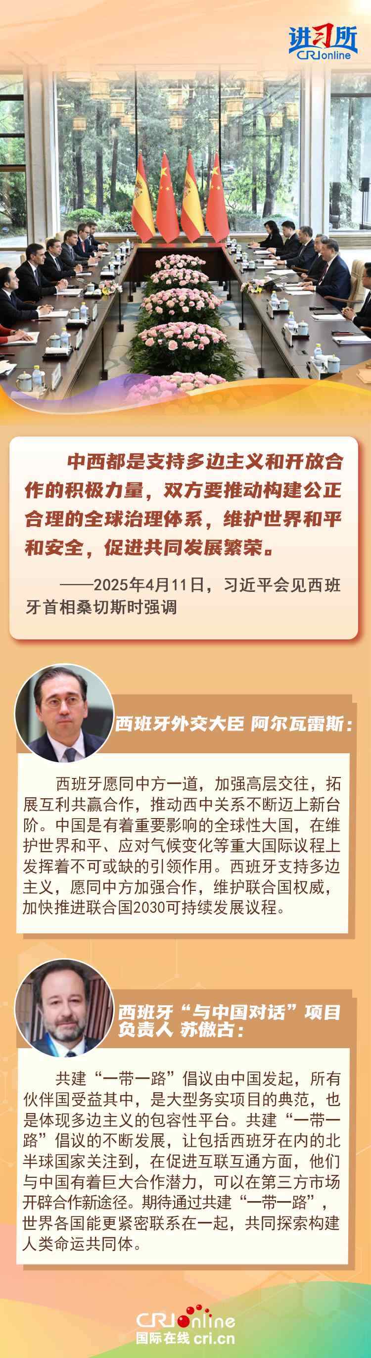 4月11日,中國國家主席習(xí)近平在北京會見來華訪問的西班牙首相桑切斯時表示,中西友好是兩國人民基于傳統(tǒng)友誼、現(xiàn)實(shí)需要、長遠(yuǎn)利益作出的正確抉擇,中西都是支持多邊主義和開放合作的積極力量,雙方要推動構(gòu)建公正合理的全球治理體系,維護(hù)世界和平和安全,促進(jìn)共同發(fā)展繁榮。