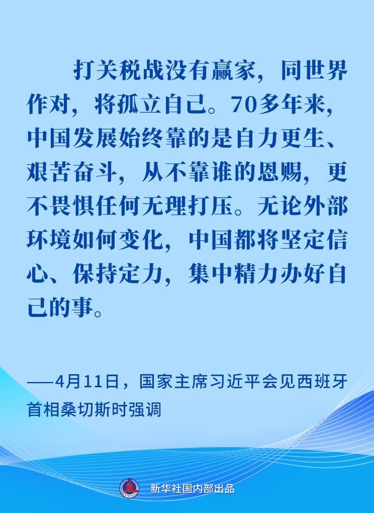 “打關(guān)稅戰(zhàn)沒有贏家,同世界作對,將孤立自己。70多年來,中國發(fā)展始終靠的是自力更生、艱苦奮斗,從不靠誰的恩賜,更不畏懼任何無理打壓。無論外部環(huán)境如何變化,中國都將堅定信心、保持定力,集中精力辦好自己的事。”