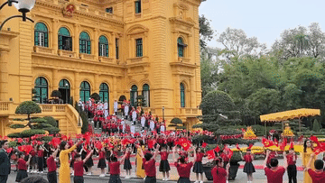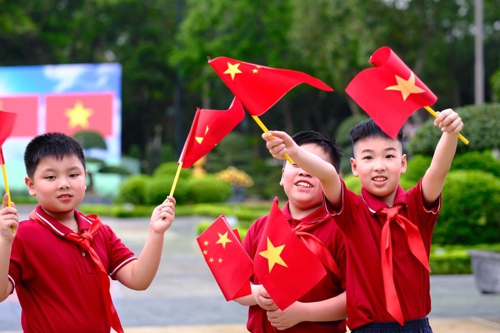 主席府廣場(chǎng)上,五星紅旗同金星紅旗迎風(fēng)飄揚(yáng),200多名越南少年兒童揮舞旗幟,熱烈歡迎習(xí)近平到訪(fǎng)。