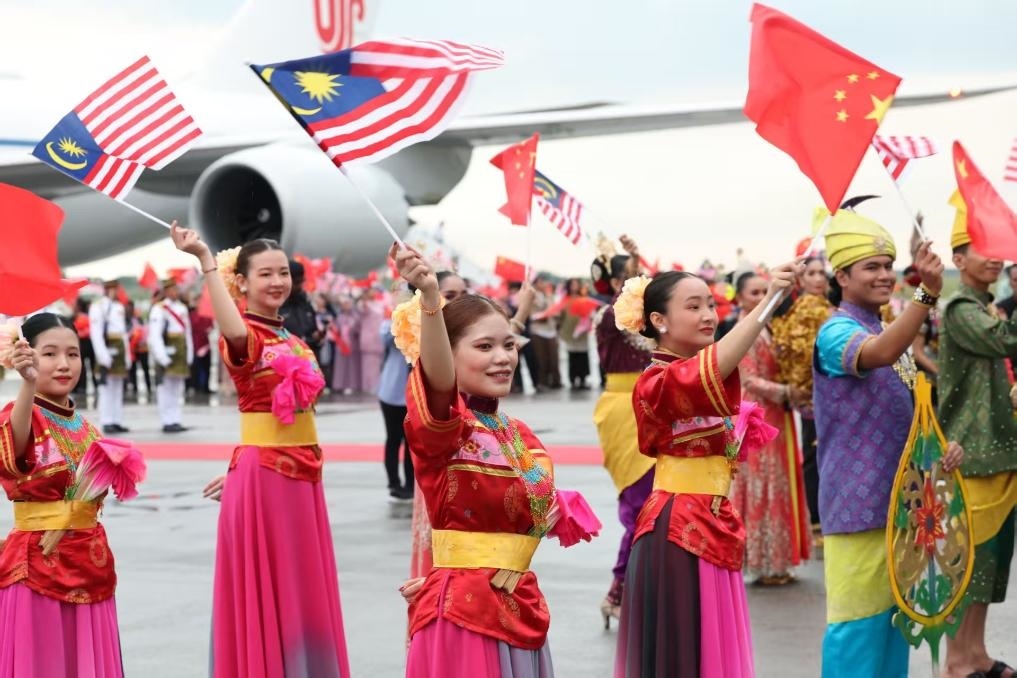 馬來西亞兒童向習(xí)近平獻(xiàn)花,馬來西亞青少年表演富有當(dāng)?shù)靥厣奈璧?,揮舞中馬兩國國旗,熱烈歡迎習(xí)近平到訪。
