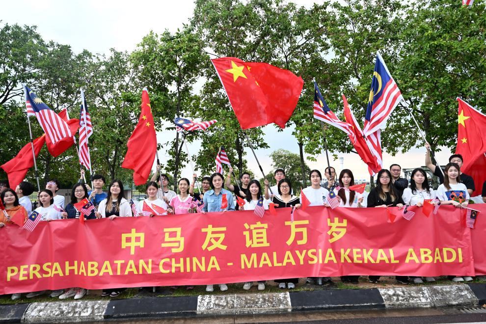 習(xí)近平乘車從機(jī)場赴下榻飯店途中,當(dāng)?shù)刂匈Y企業(yè)人員、留學(xué)生在道路兩旁揮舞中馬兩國國旗,高舉“熱烈歡迎習(xí)近平主席訪問馬來西亞”、“中馬友誼萬歲”等紅色橫幅,華僑華人表演喜慶熱烈的舞獅,歡迎習(xí)近平到訪。