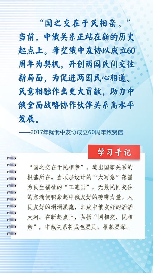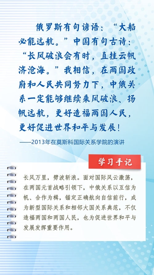 中華民族和俄羅斯民族都有悠久的歷史、古老的文明、燦爛的文化,都是偉大的民族。近年來,習近平主席常常引用中國詩詞古語、俄羅斯諺語名言等,寄語中俄關系發(fā)展和全人類和平與發(fā)展。這些重要論述,蘊含對文明、歷史的深邃思考,指引著新時代的中俄關系不斷向前,為世界百年變局中的人類文明進步事業(yè)指明方向。