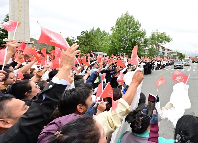 8月20日中午,中共中央總書記、國家主席、中央軍委主席習(xí)近平率中央代表團(tuán)乘專機(jī)抵達(dá)拉薩,出席西藏自治區(qū)成立60周年慶?;顒?dòng)。習(xí)近平等從機(jī)場乘車到住地途中,各族群眾在街道兩旁熱情歡迎。