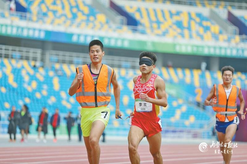10月27日,內(nèi)蒙古盲人運(yùn)動員李歡同他的領(lǐng)跑員楊愛瑞獲得男子800米t11級銅牌。