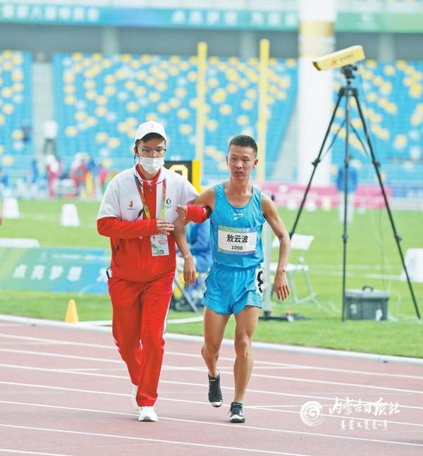 志愿者攙扶內(nèi)蒙古殘疾人運(yùn)動員敖云波。