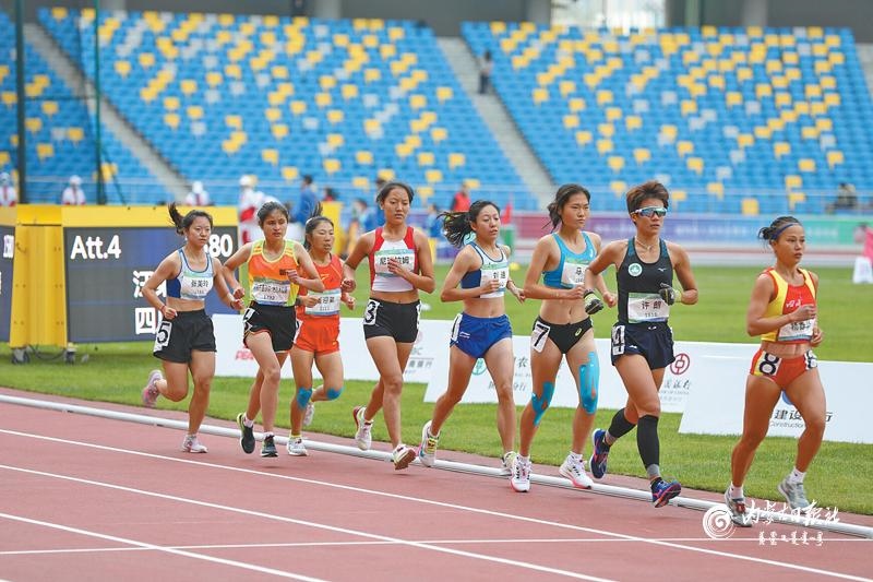 10月23日,內(nèi)蒙古運(yùn)動員姜迎弟(左三)在女子萬米聽障比賽中與各路高手角逐。