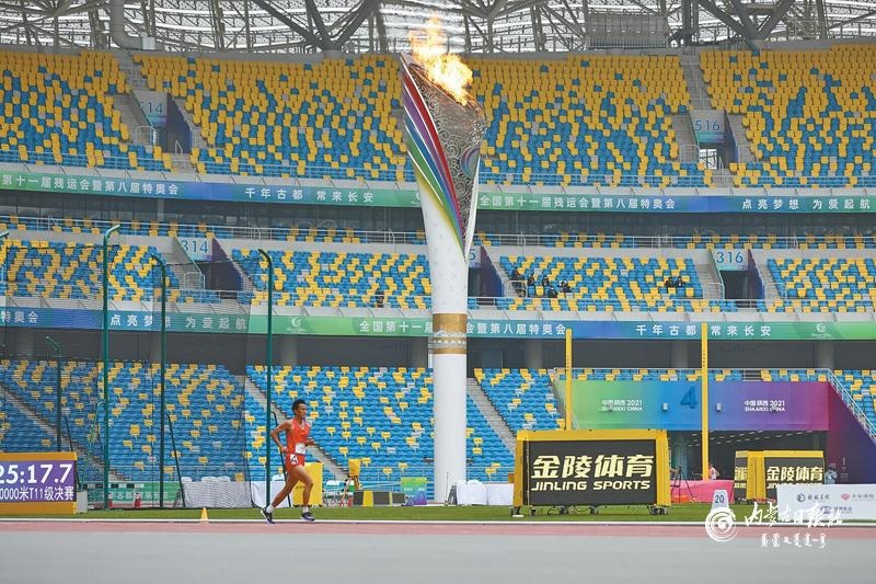 10 月23 日,男子t11 級10000米的賽場上,內(nèi)蒙古運(yùn)動員孟可在沒有領(lǐng)跑員的不利條件下,依然堅持跑完了全程。