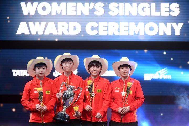 11月29日,四位中國選手——冠軍王曼昱(左二),亞軍孫穎莎(左一),并列季軍陳夢(右二)、王藝迪在頒獎(jiǎng)儀式后合影。新華社記者 吳曉凌/攝