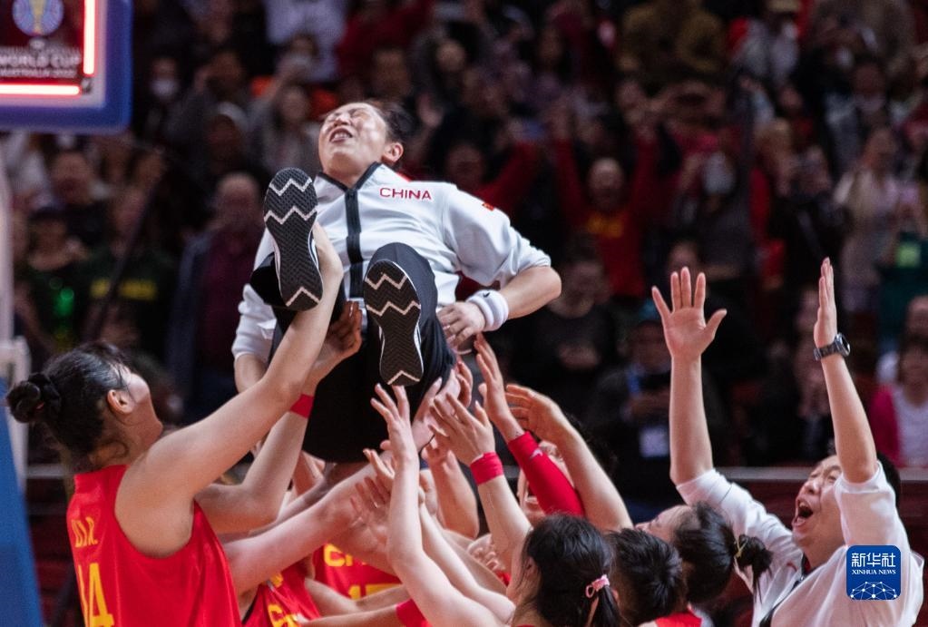 9月30日,中國(guó)隊(duì)主教練鄭薇(上)在比賽后被隊(duì)員拋起慶祝。