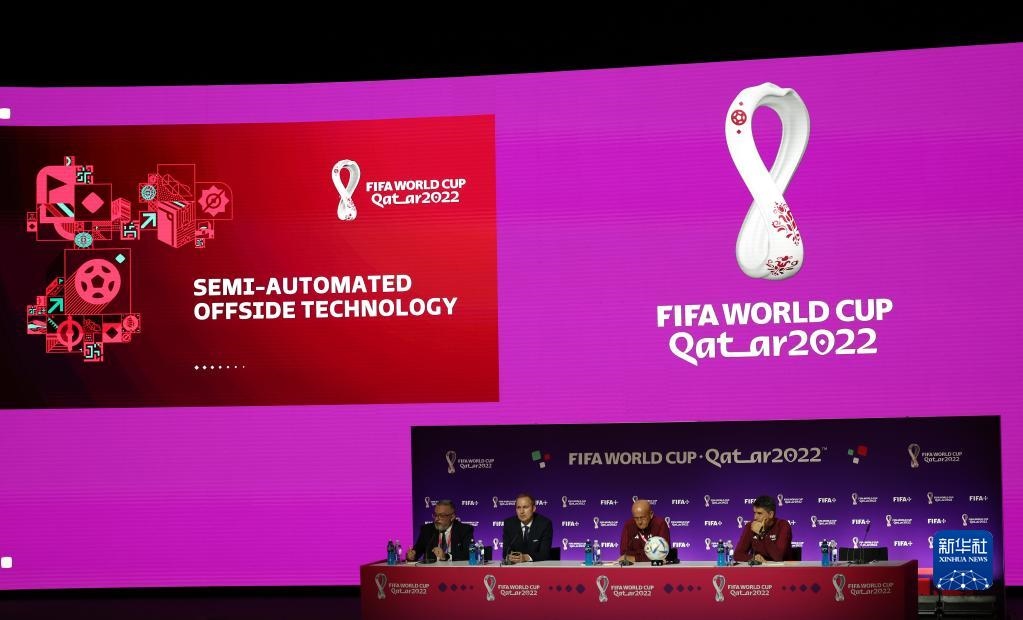 11月18日,國際足聯(lián)足球技術(shù)與創(chuàng)新總監(jiān)霍爾茲穆勒(左二)在通氣會上介紹半自動越位識別技術(shù)。新華社記者 賈浩成 攝