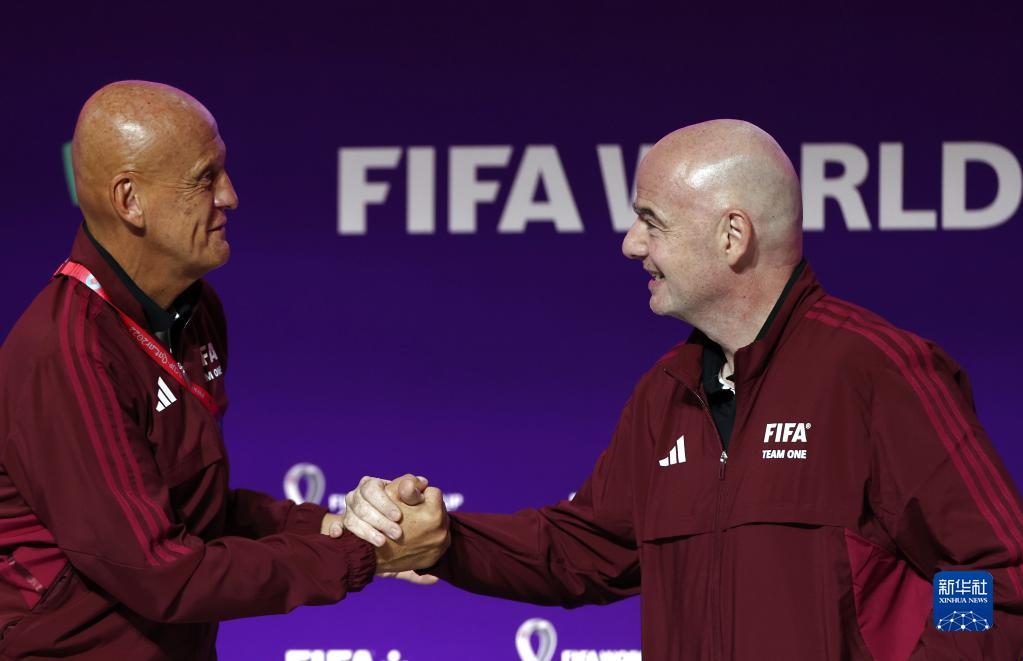 11月18日,國際足聯(lián)主席因凡蒂諾(右)與國際足聯(lián)裁判委員會主席皮耶路易吉·科利納在通氣會上握手致意。新華社記者 賈浩成 攝