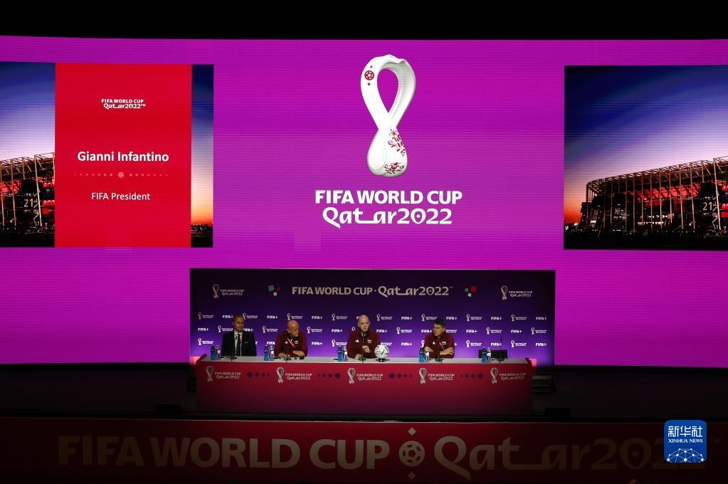 11月18日,國際足聯(lián)主席因凡蒂諾(右二)在通氣會上發(fā)言。新華社記者 賈浩成 攝
