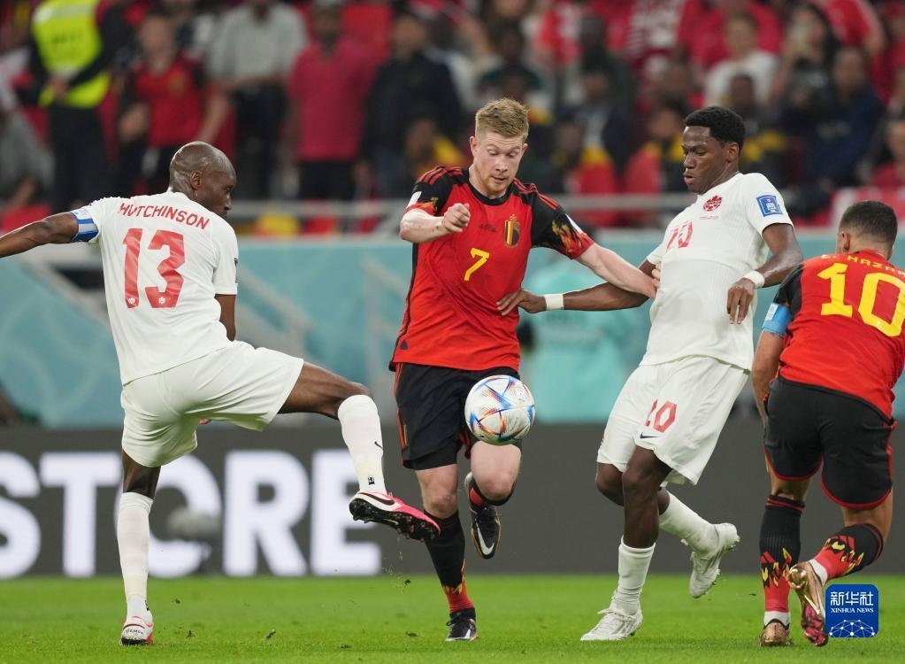 11月23日,比利時隊(duì)球員德布勞內(nèi)(左二)在比賽中進(jìn)攻。新華社記者 李鋼 攝