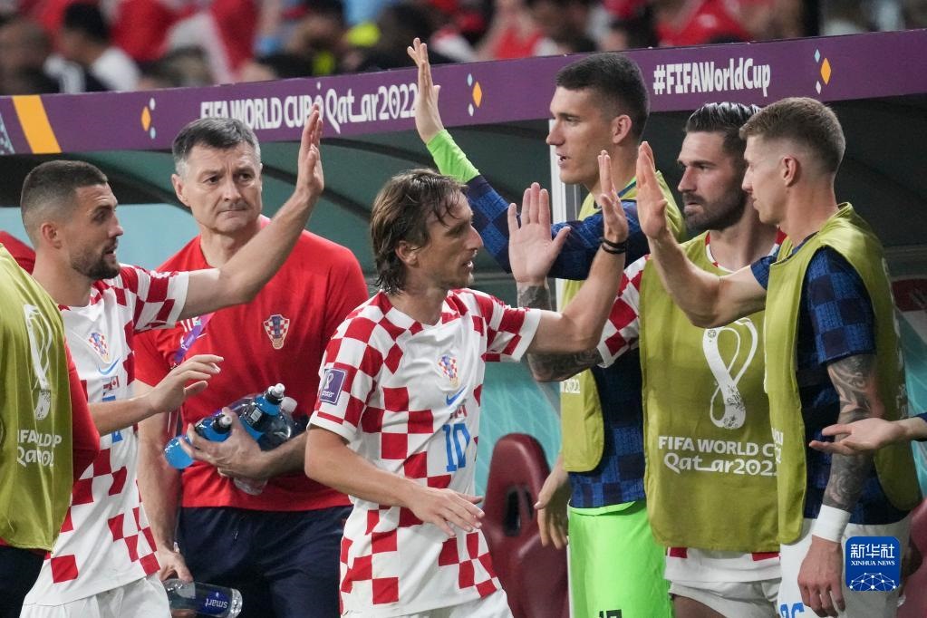 11月27日,克羅地亞隊球員莫德里奇(左三)在比賽中被替換下場后與隊友致意。